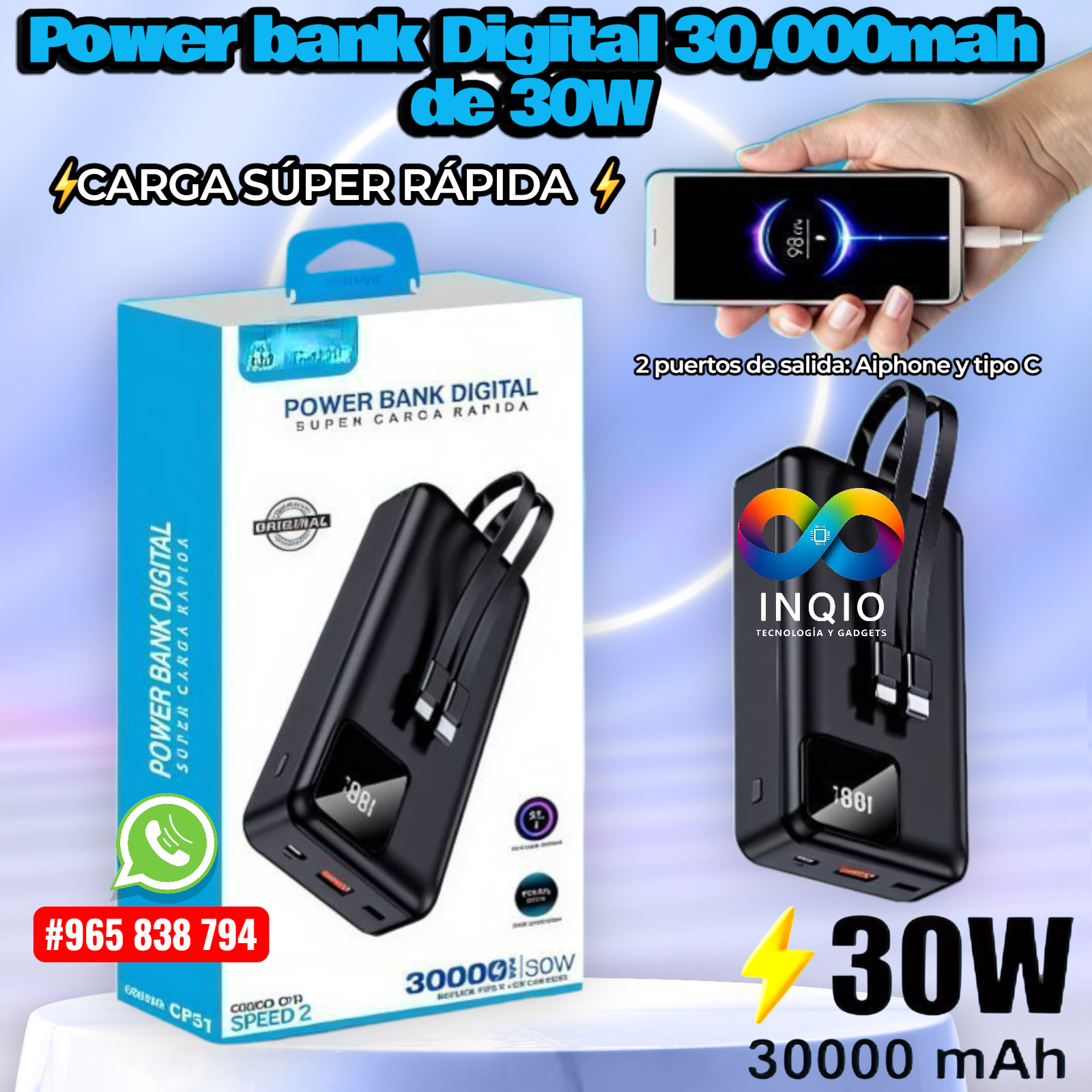 ¡Carga rápida y confiable 🔋⚡! El Power Bank 30000mAh Original ofrece carga súper rápida de 30W, pantalla digital y doble cable integrado para tus dispositivos. Ideal para viajar o uso diario.