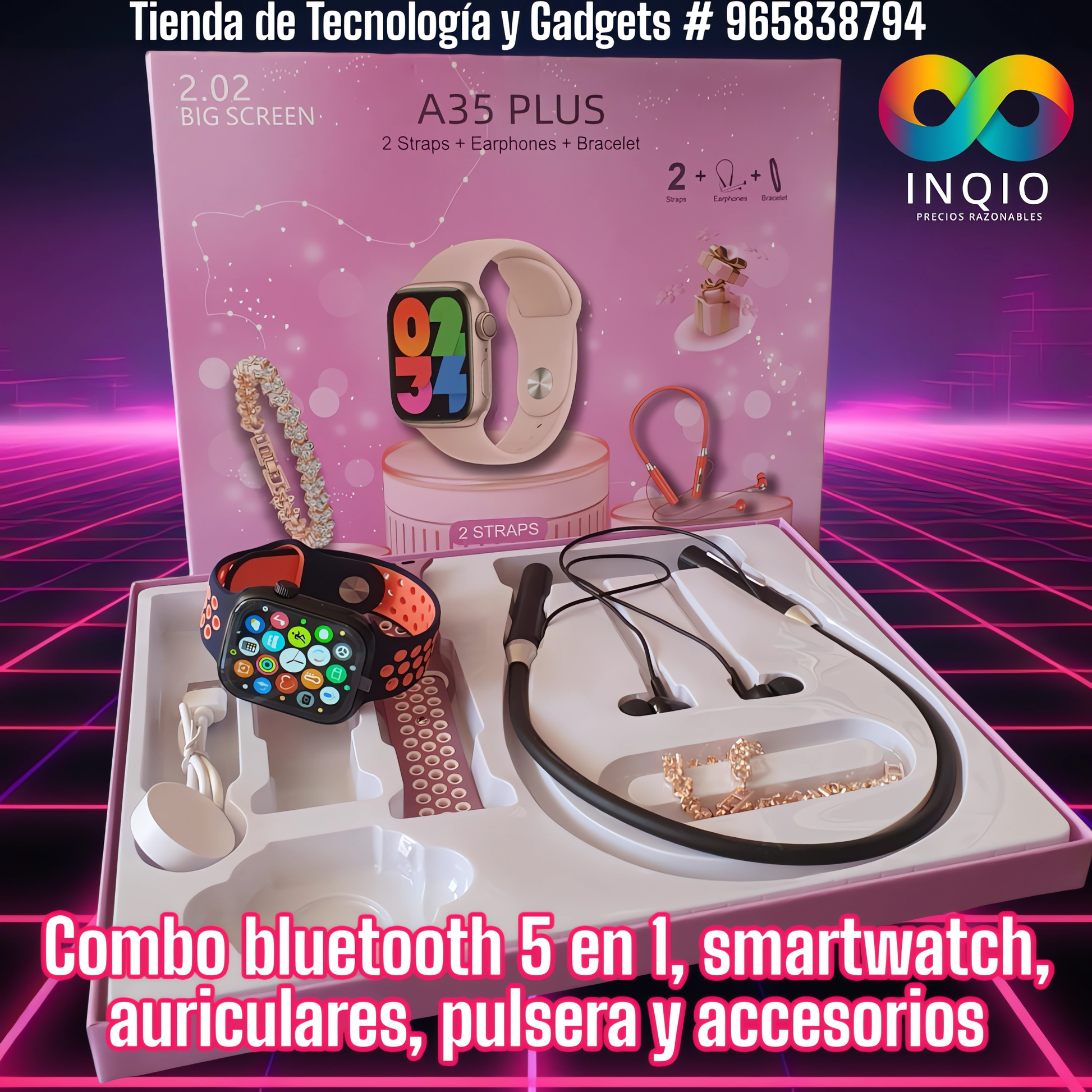 🔹 Potencia tu estilo y conectividad con el Combo Bluetooth 5 en 1, un paquete completo que incluye Smartwatch, Auricular Bluetooth, Pulsera Inteligente y Accesorios. Perfecto para quienes buscan estar conectados, saludables y a la moda.
